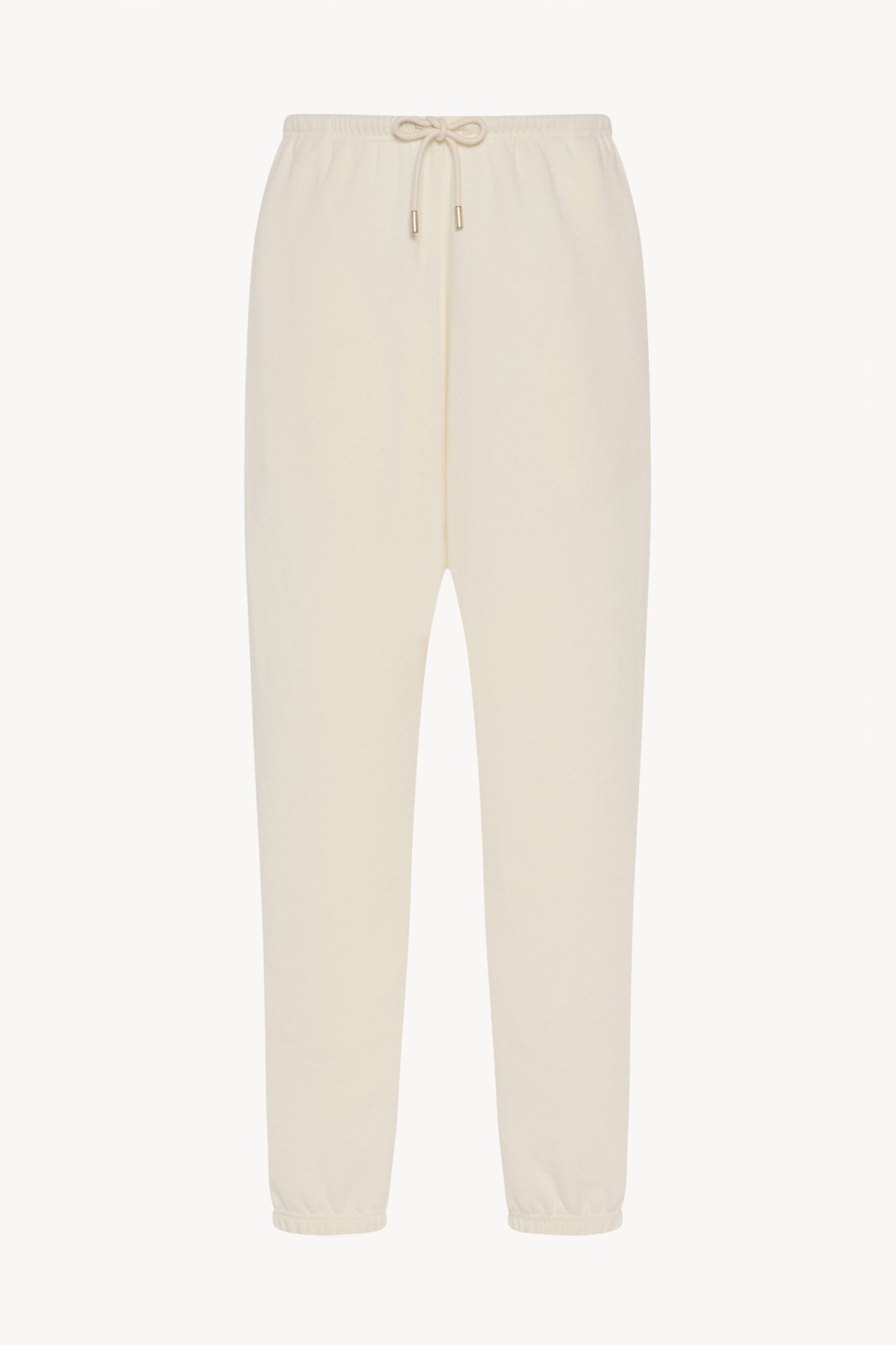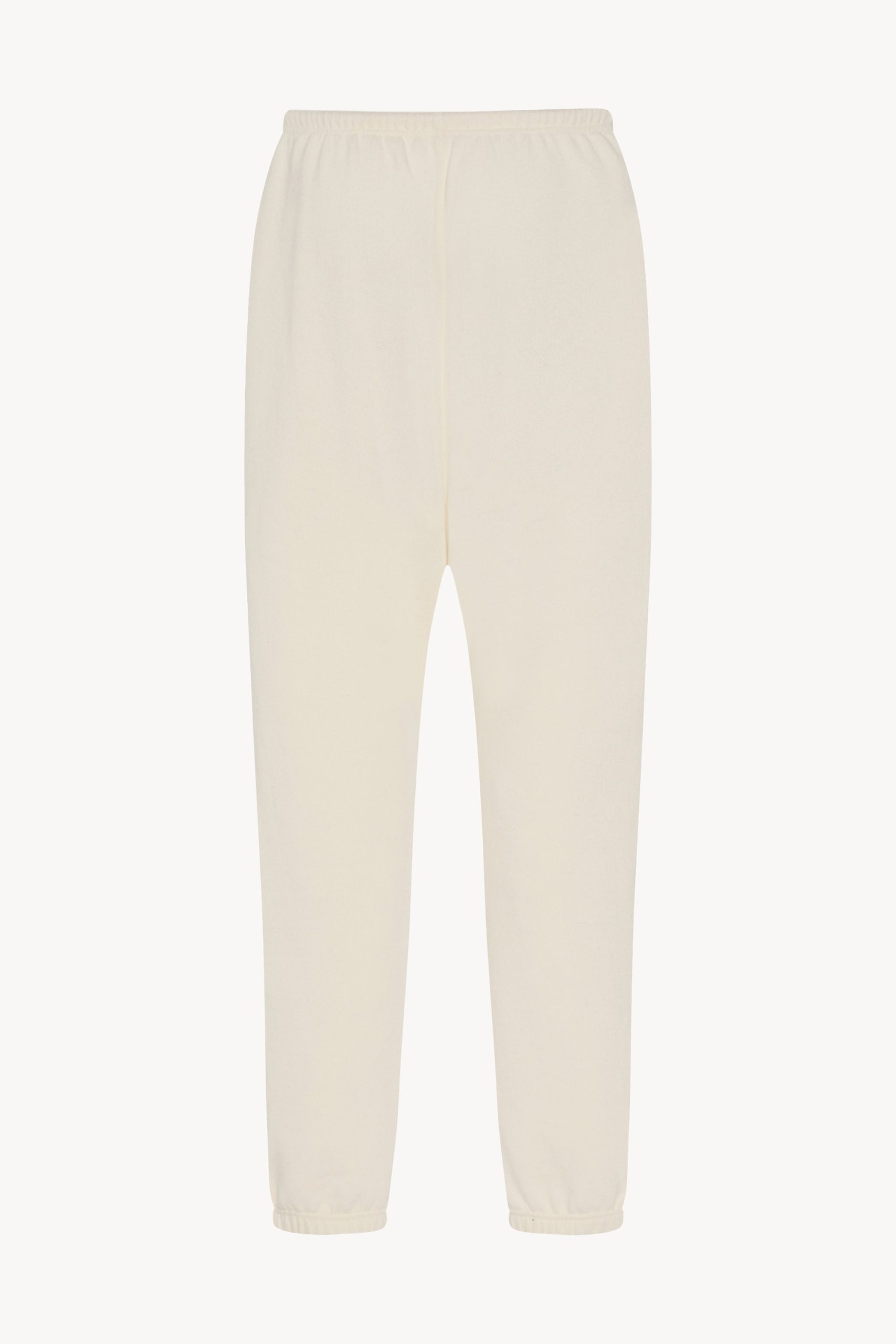 Mid-rise pant in cashmere and cotton French terry with slightly tapered leg. drawstring waist. and side seam pockets.