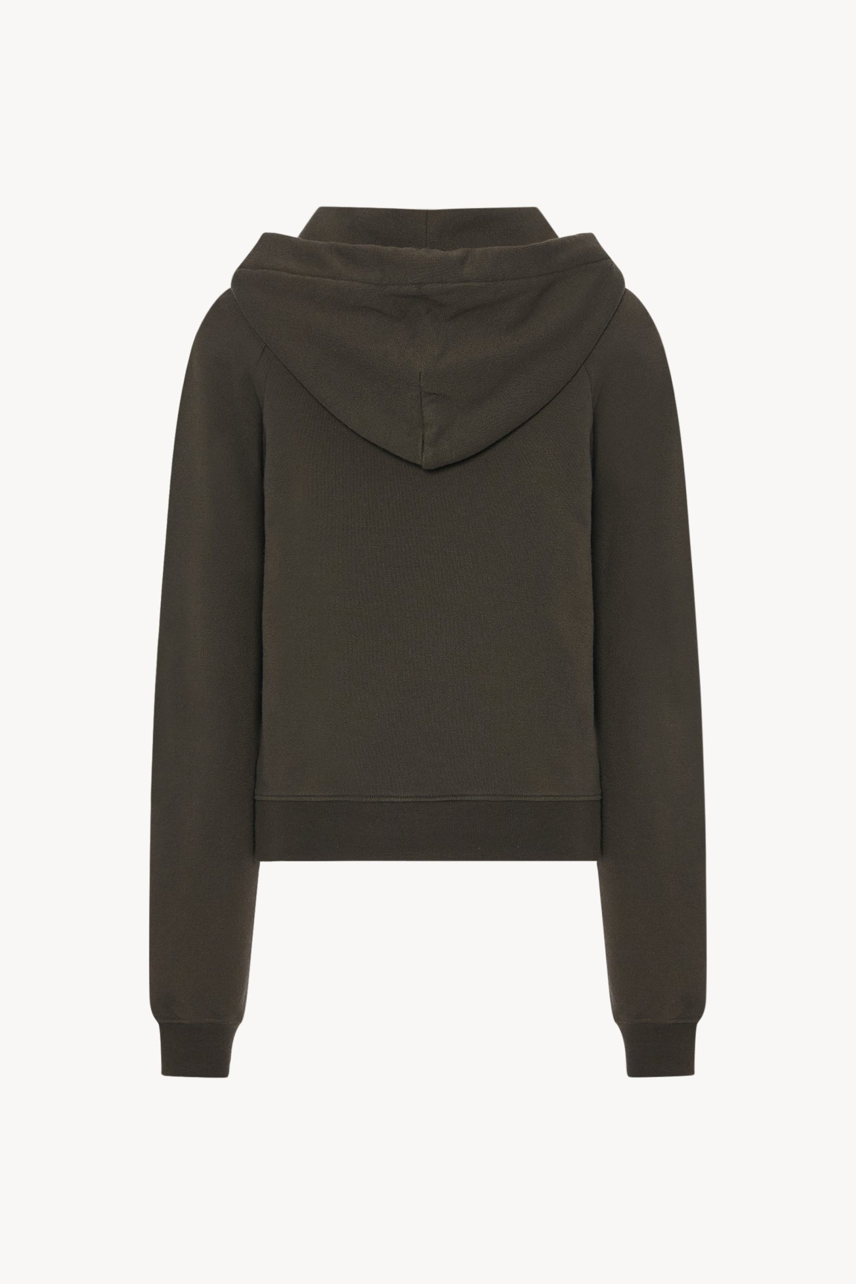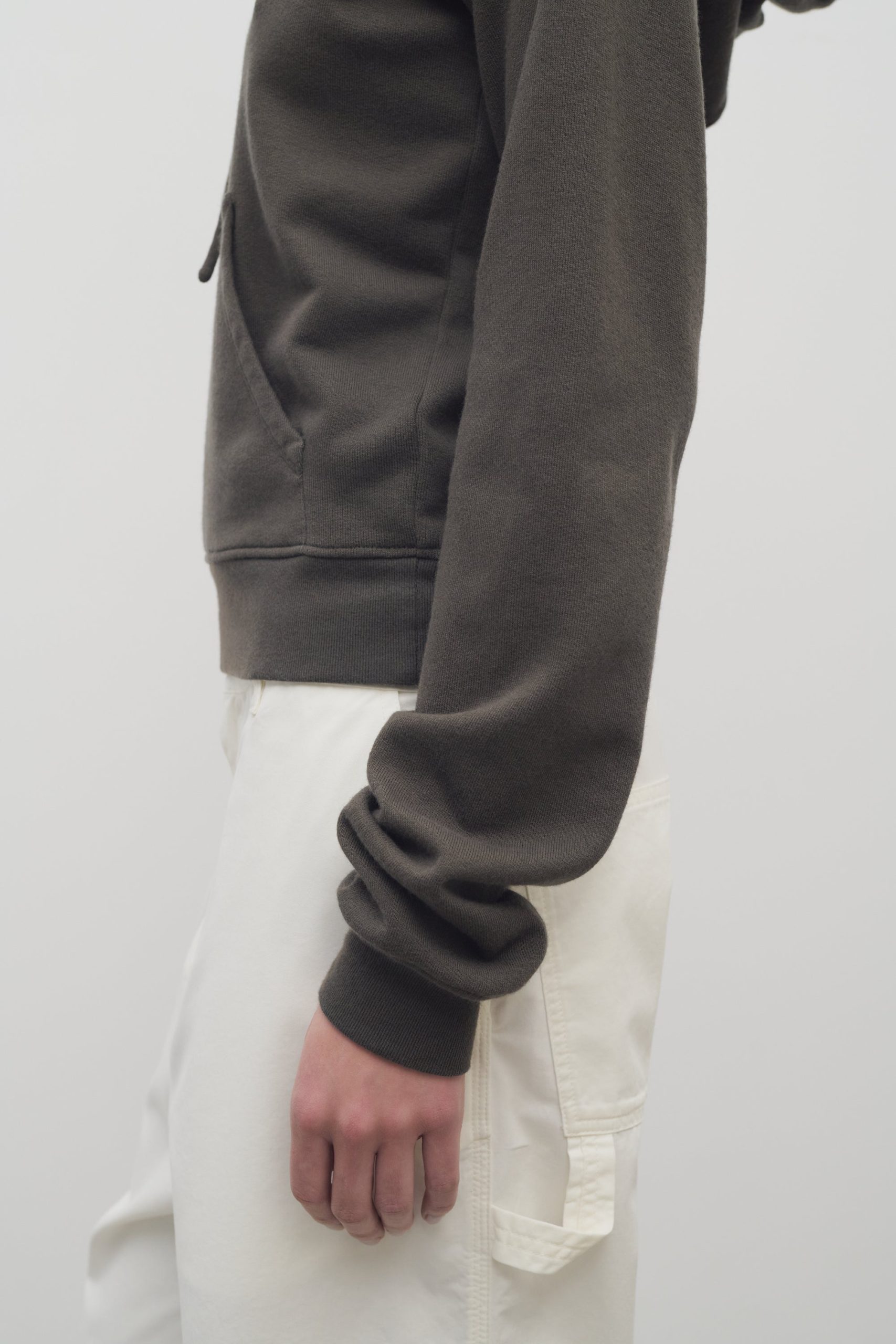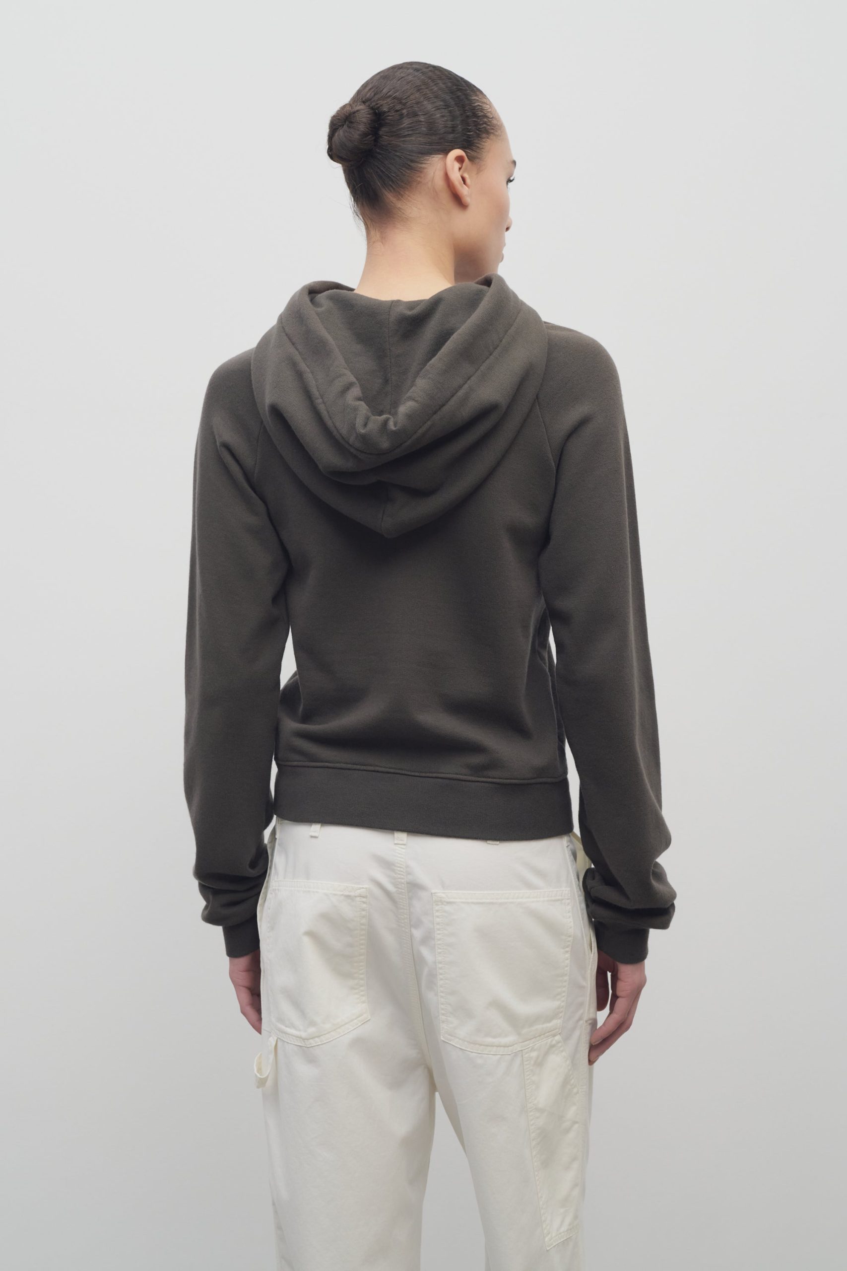 Slim hooded sweatshirt in cotton and cashmere French terry with raglan sleeves. front pouch pocket. and ribbed cuffs and hem.