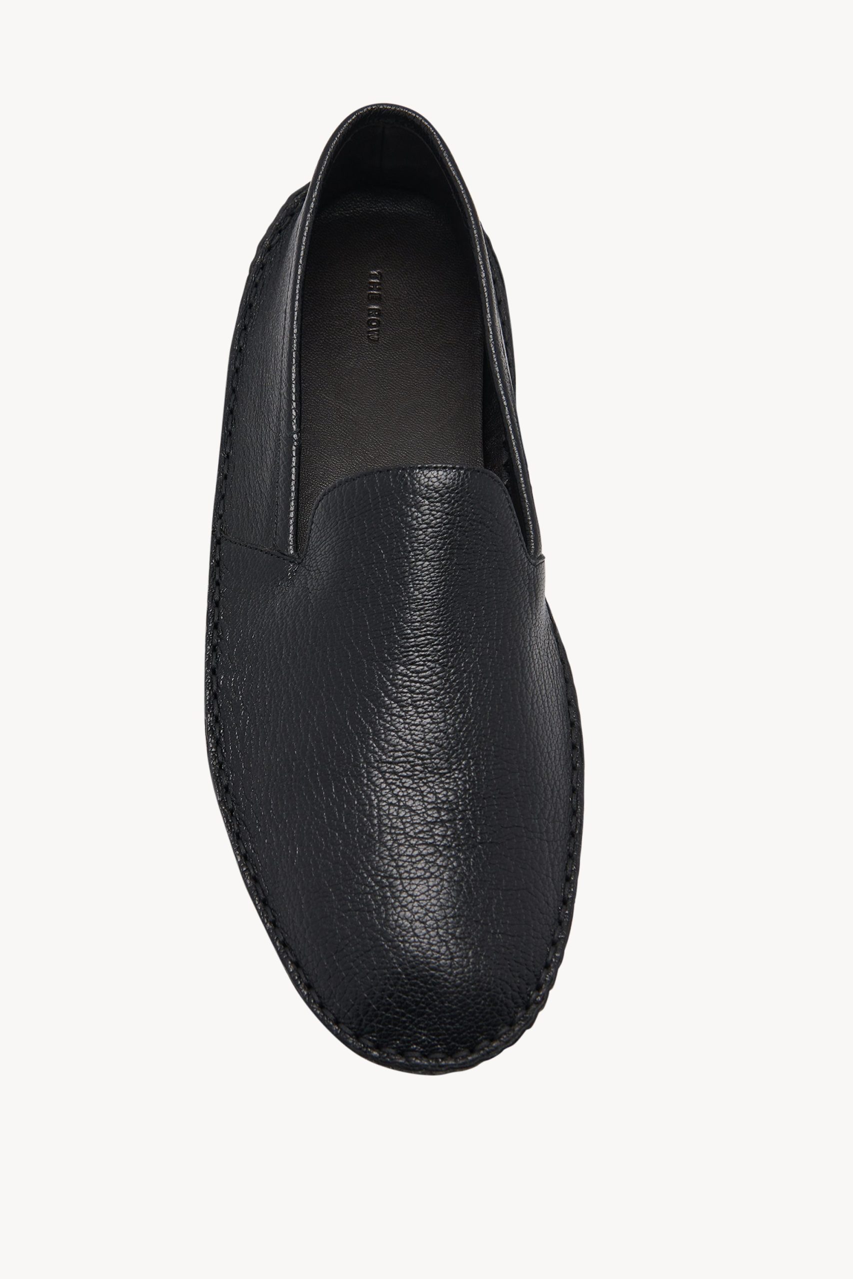 Streamlined car shoe in grained calfskin leather with raised outer seam and rubber sole.