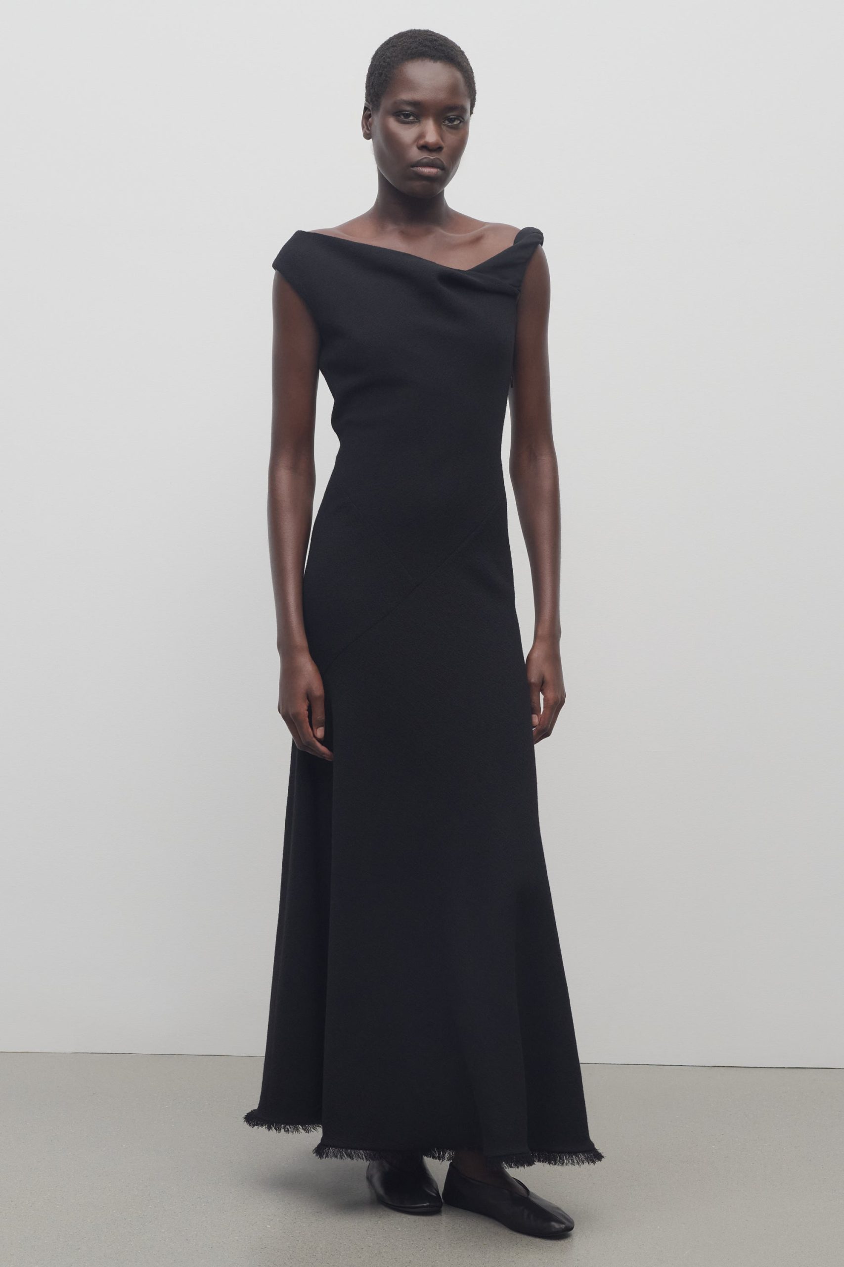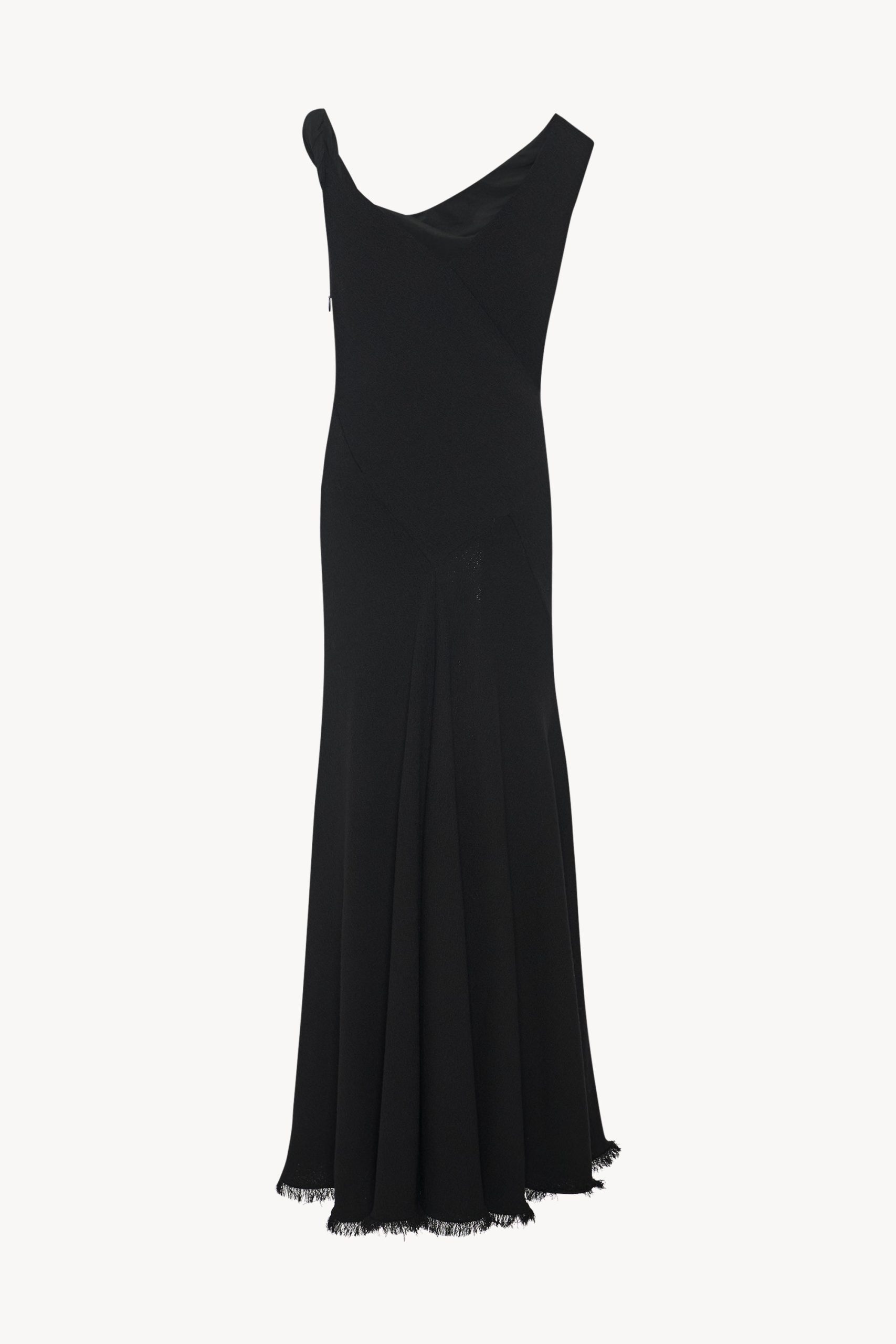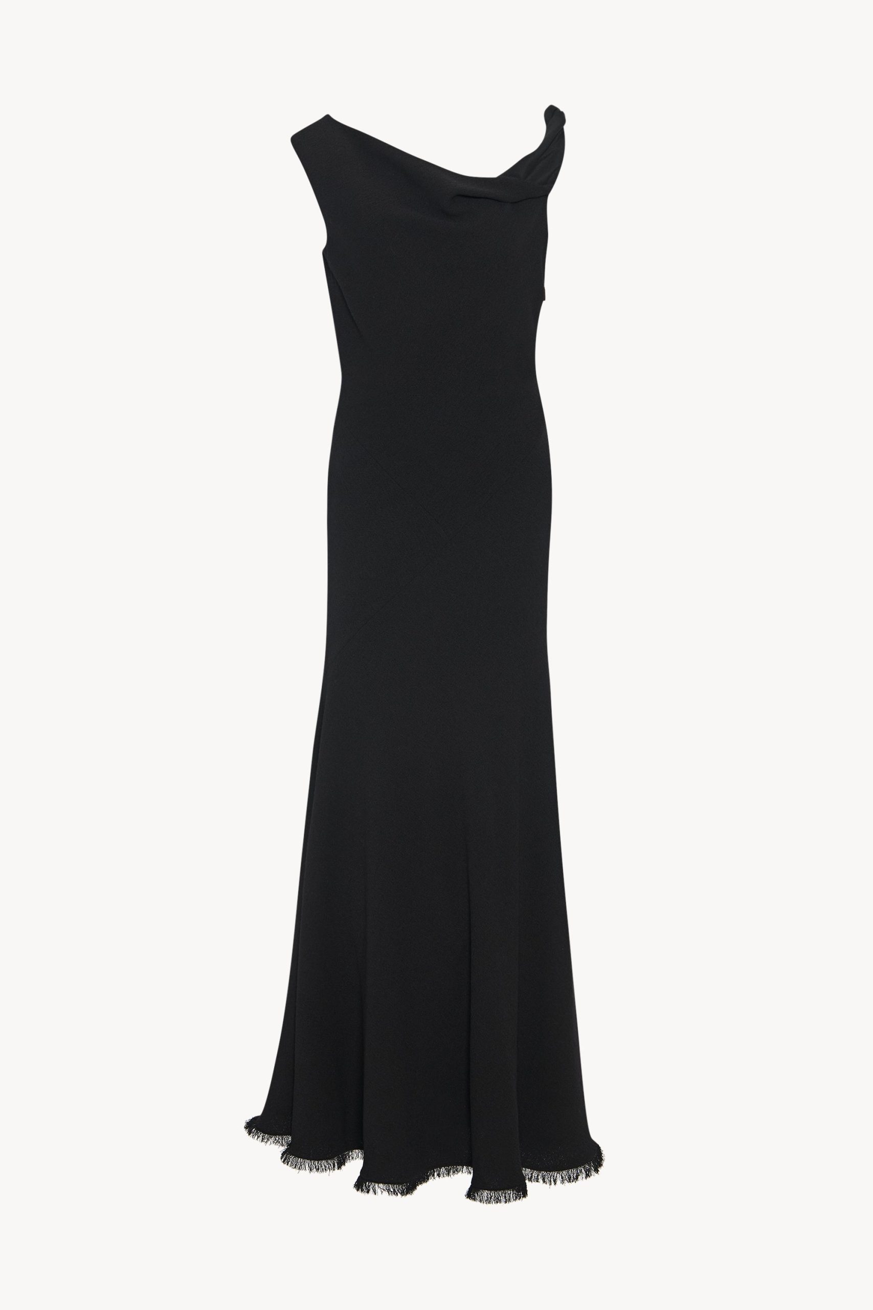 Ankle-length evening dress in textured matte wool crepe with asymmetrical neckline. paneled construction. and flared fit.