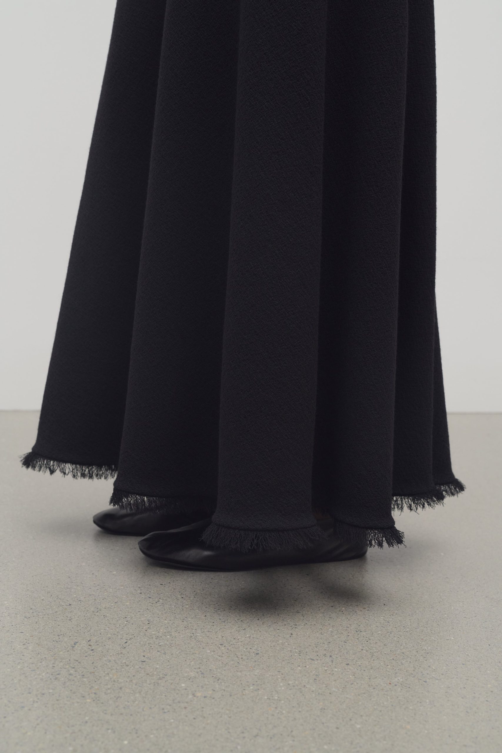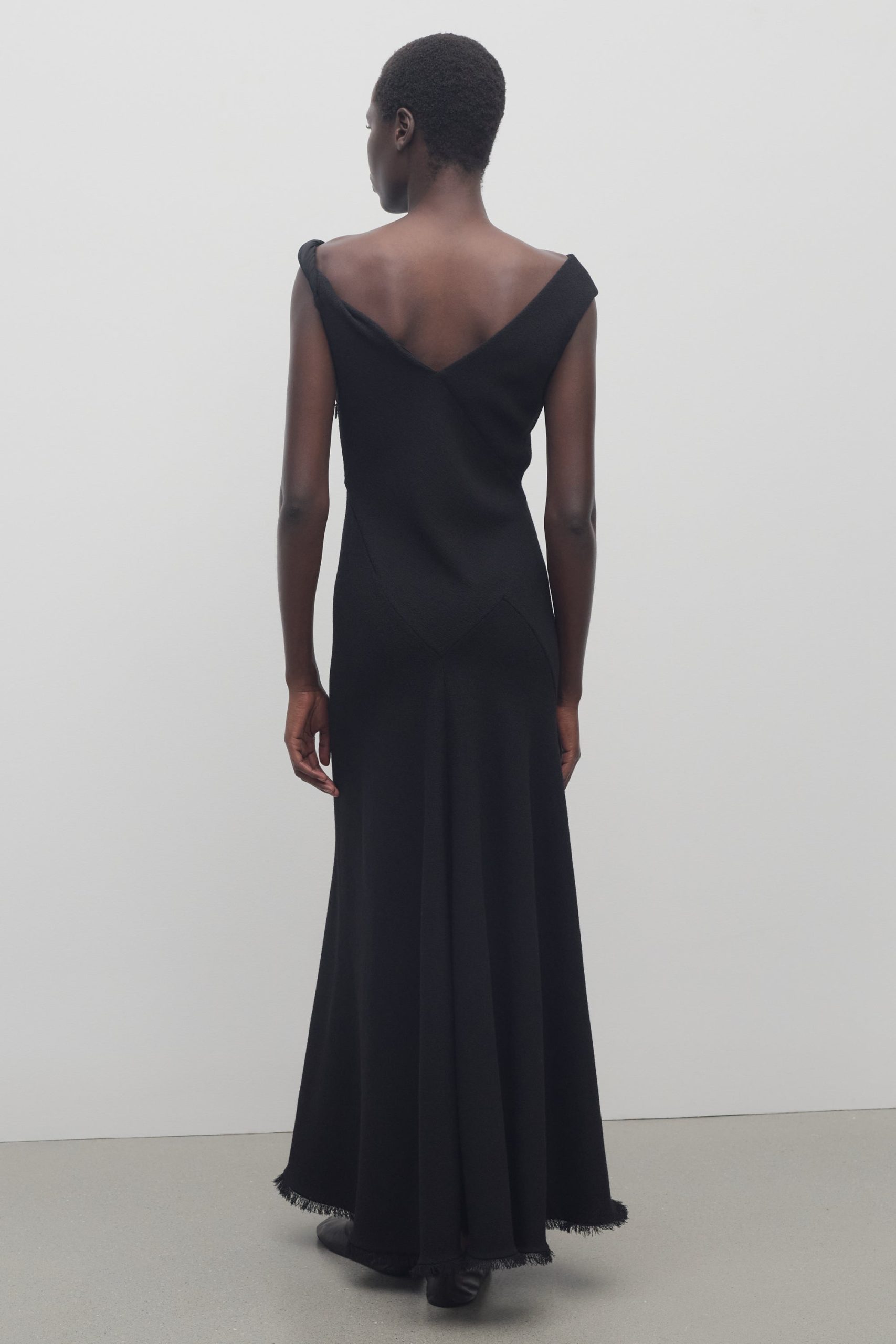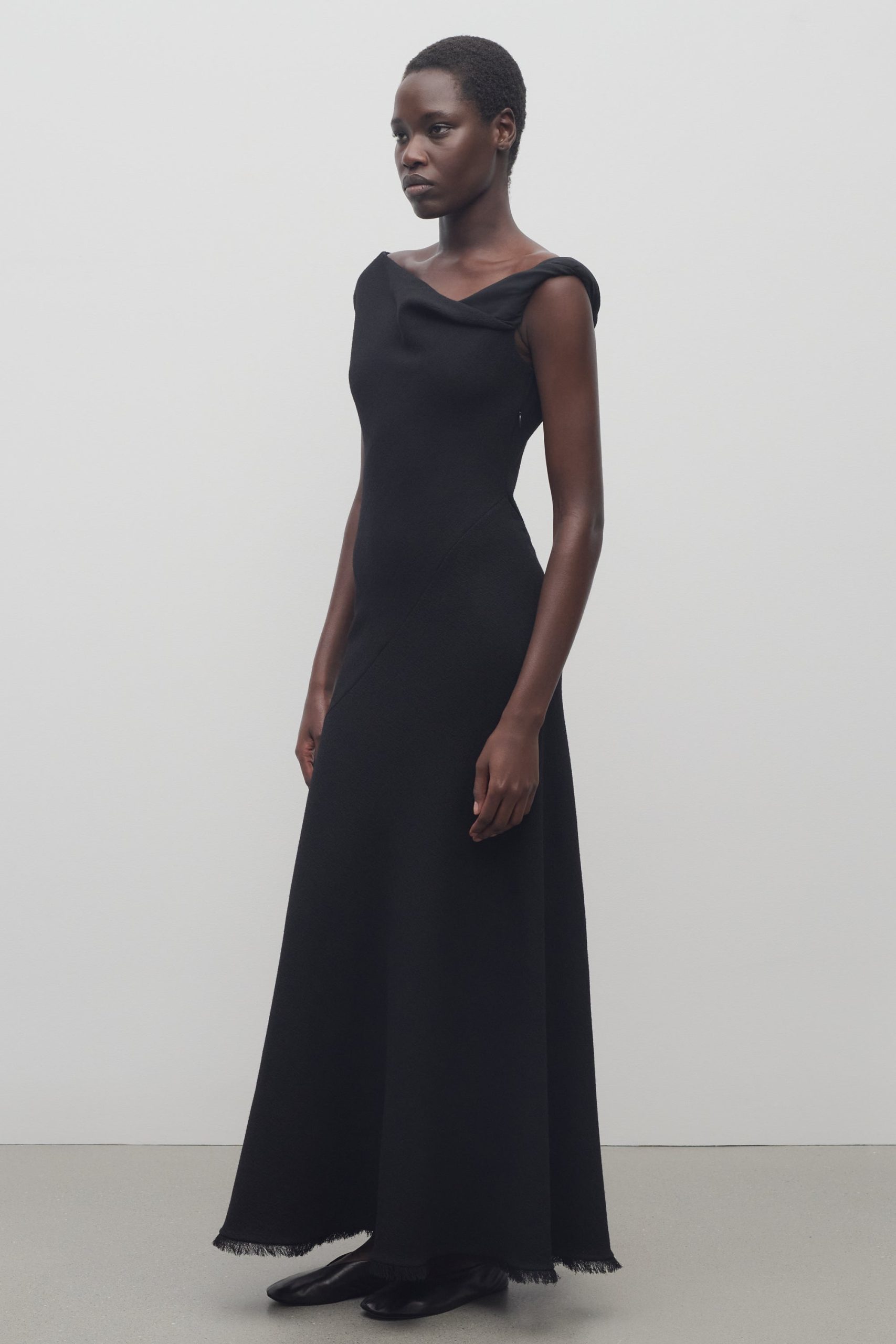 Ankle-length evening dress in textured matte wool crepe with asymmetrical neckline. paneled construction. and flared fit.