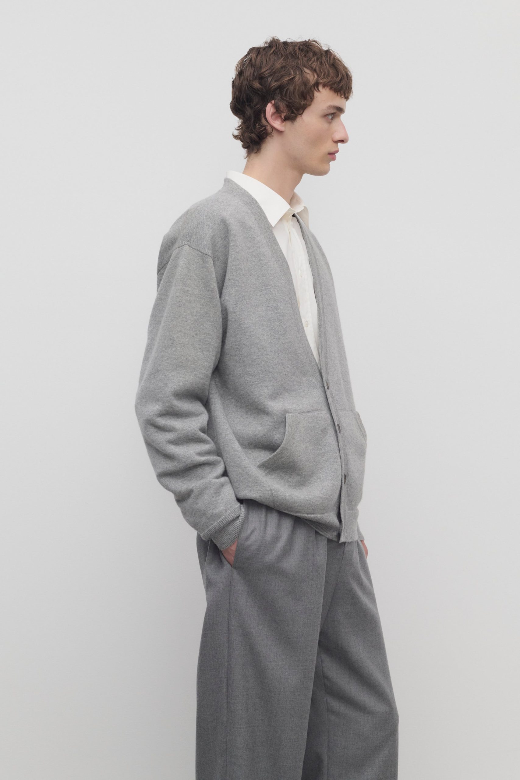 Oversized v-neck cardigan in ultrafine cashmere with front pouch pocket. front button closure. and ribbed cuffs and hem.
