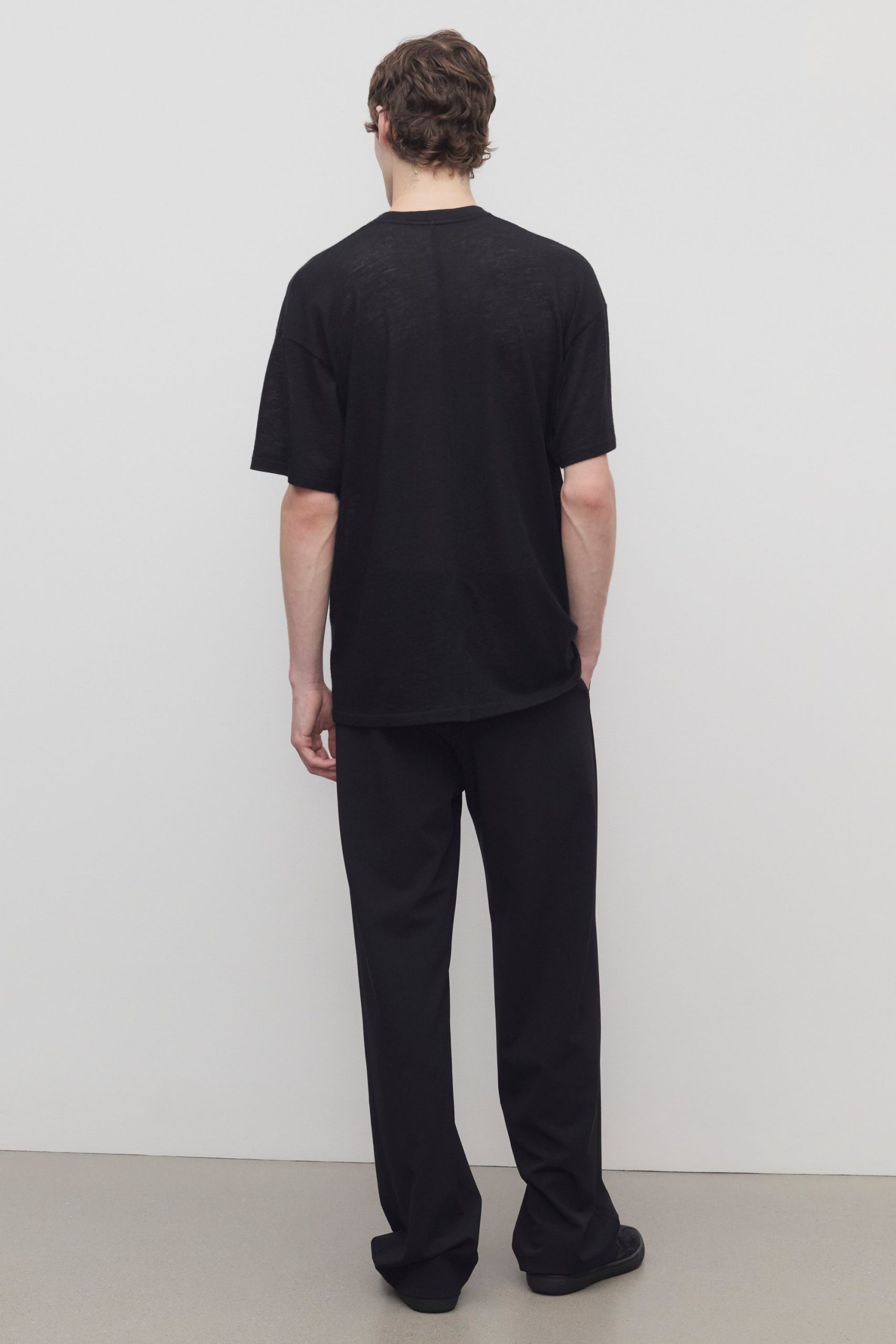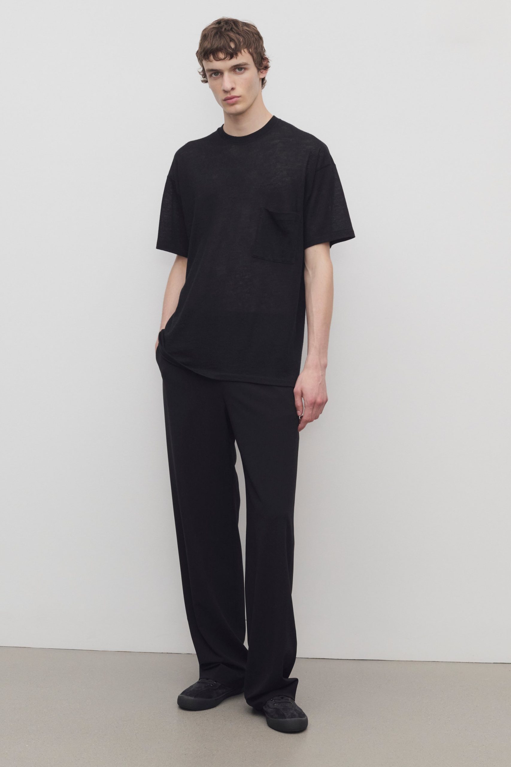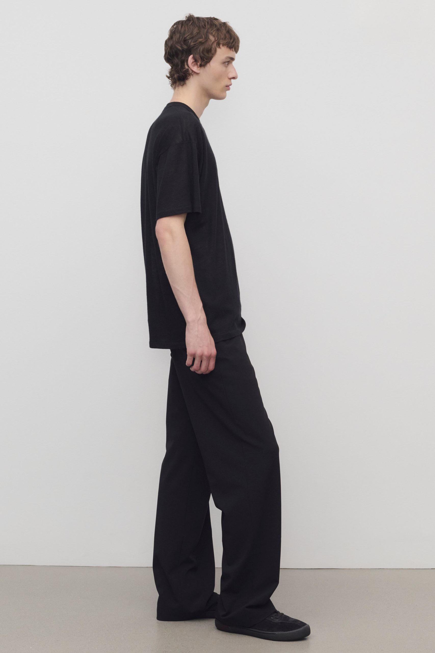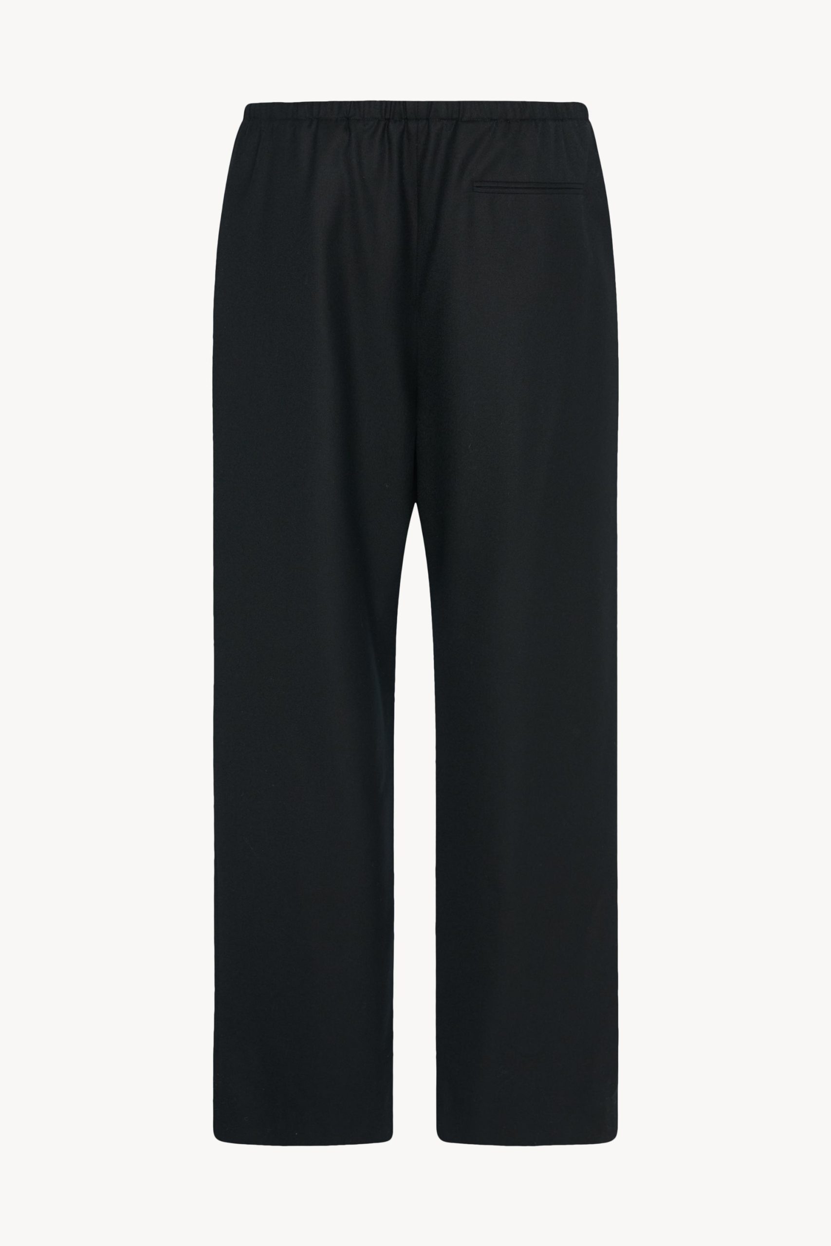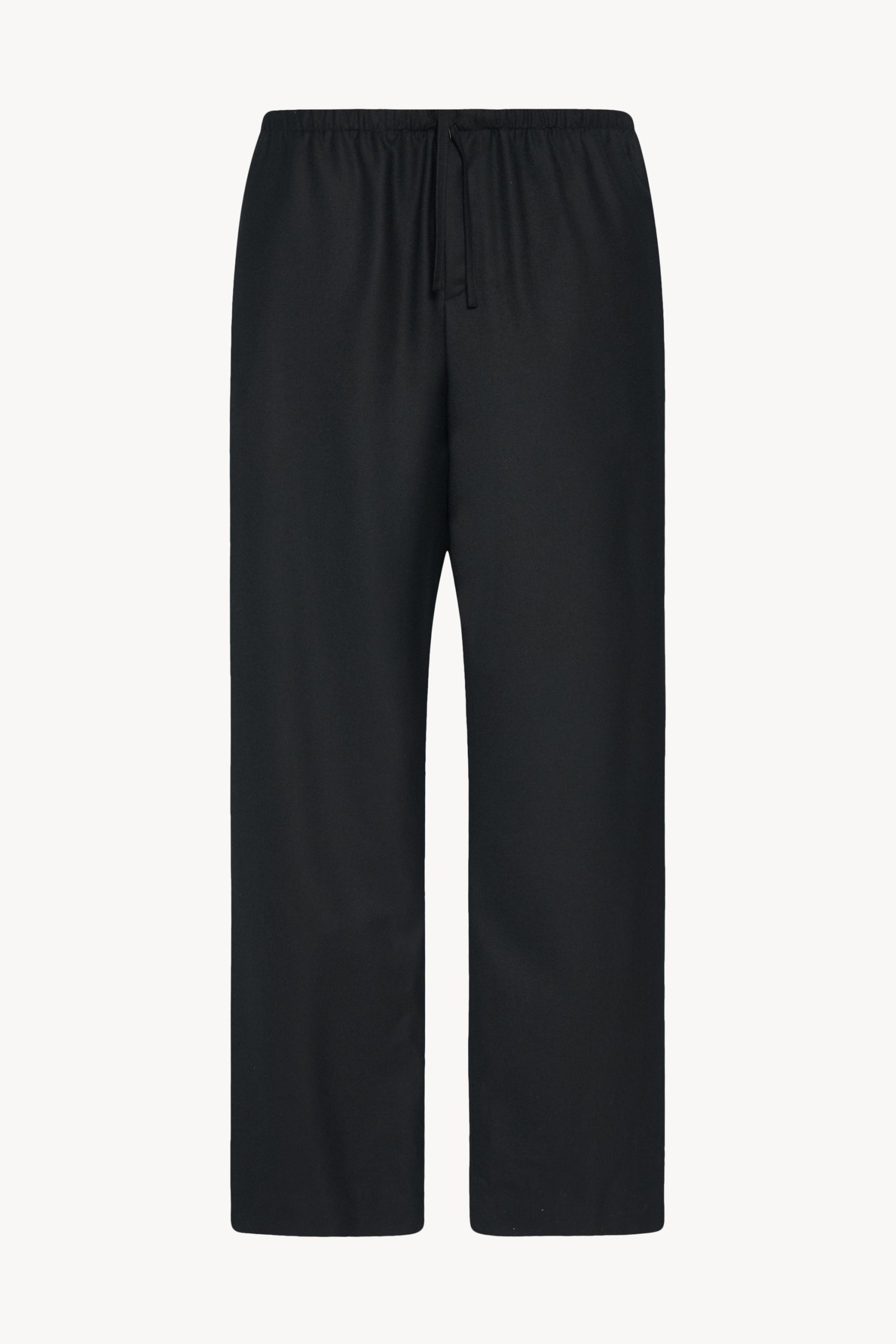 Relaxed pull-on pant in virgin wool flannel with wide. straight leg. elasticated drawstring waist. and side seam pockets.